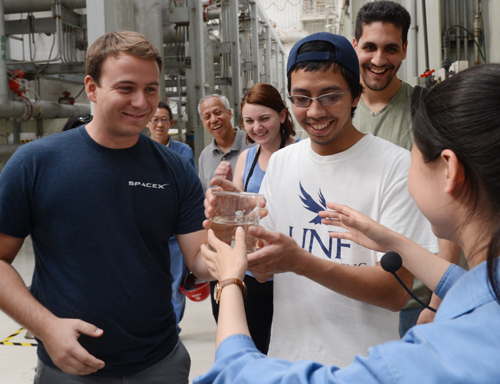 图为外国友人看到经城市生活污水处理中心处理后达到饮用水标准的水样赞叹不已。 张轩瑜 摄