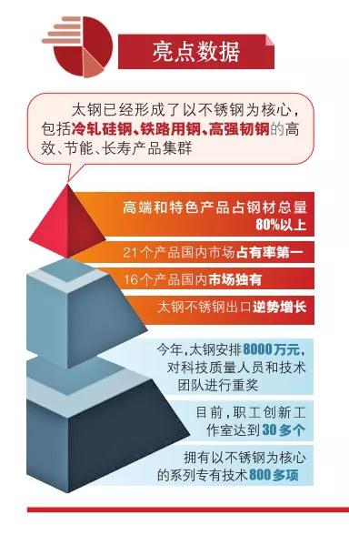 太钢鼓励科研人员大胆探索、主动创新,激发了科技创新的动力活力;加大激励力度,重奖有突出贡献的优秀创新人才和创新团队。今年,太钢安排8000万元,对科技质量人员和技术团队进行重奖,充分激发全员的创新热情。目前,太钢职工创新工作室达到30多个,拥有以不锈钢为核心的系列专有技术800多项。