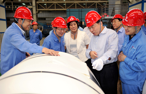 座谈结束后,梅克保一行在太钢领导的陪同下参观了炼铁厂4350立方米高炉和不锈冷轧厂新线。在4350立方米高炉前,李晓波详细介绍了高炉的运营状况。他说,4350立方米高炉是世界上装备水平最先进的高炉之一,具有很高的运行效率和节能环保水平,包括高炉余压发电,炼铁过程中有害气体回收利用、炉渣加工制水泥等,都实现了循环利用。梅克保一边听,一边关切地询问各项生产指标。在不锈冷轧厂李晓波向梅克保详细介绍了太钢不锈钢产品的生产工艺、用途及特性,以及太钢近年来坚持做强主业、延伸发展、绿色发展、和谐发展的企业发展思路。听完介绍后,梅克保点头称赞。在一卷卷堆放整齐的成品卷前,梅克保驻足仔细观看,不时地向工作人员询问产品的用途及特性,并要求大家一定要严格质量控制,把产品做精、做细。