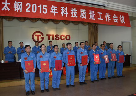 集团公司董事、不锈钢股份公司总经理张志方宣读了表彰决定。大会对2014年质量先进单位,“质量—成本(Q&C)最佳操作者/管理者”,重大质量消耗攻关项目团队、产品质量品牌建设成果、优秀六西格玛项目,省部级以上获奖科技成果进行了表彰。大会特别授予重载车轴钢研发及大规格车轴坯降判攻关、高炉冲渣水直接换热余热回收技术开发及应用、提高不锈钢无修磨比例、太钢住宅楼房加固改造工程4个科技团队“2014年度太钢优秀科技工作团队”称号,奖励每个团队20万元;授予技术中心不锈钢室高级工程师王贵平、总医院神经内科主任夏海琴、峨口铁矿露天转地下项目部工艺技术部长刘俊平“2014年度太钢优秀科技工作者”称号,奖励每人10万元。