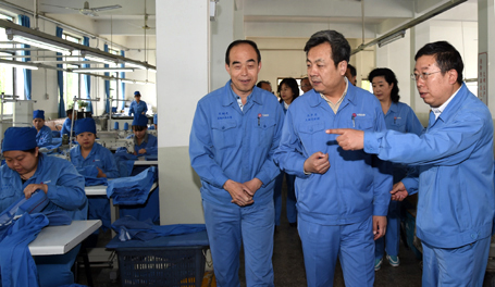 图为高祥明在福利总厂看望职工并了解工装生产加工情况。 王旭宏 摄